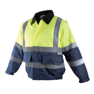 Blouson combine avec bandes réfléchissantes. Partie supérieure en haute visibilité. Col chemise polaire a capuche. Fermeture éclair en nylon cachee par rabat en scratch. Manches démontables. Deux poches sur la manche avec rabat et scratch. Une bande réfléchissante sur l’épaule, au dos et sur les manches. Poignet élastique. Fermeture en scratcha la ceinture et élastique sur les cotes. 100% Polyester.