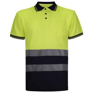 Polo pique spécial Bicolor de haute visibilité. Poche plaquée sur le devant cote droit, avec fermeture par velcro. Trois boutons sous patte, de couleur bleu marine contrastante. Manches avec poignets et col en bord-cote, avec lisières jaunes. Couture double sur les épaules et l’emmanchure. Ouverture sur le cote. Tissu traite contre les déformations et les rétrécissements excessifs. Complement tissu HV et 2 bandes réfléchissantes, 25 cycles de lavage. 55% coton 45% polyester.