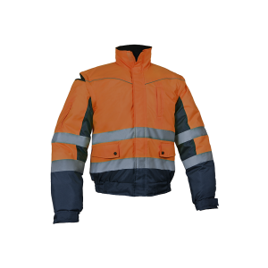 Veste de haute visibilité bicolor en tissu Oxford. Manches amovibles. Coutures thermoscellées. Poche supérieure avec rabat sur la poitrine. Poches doubles sur les cotes. Ouverture latérale et supérieure sous patte. Intérieur ouate. Ouverture sur le devant avec glissière et boutons a pression non métalliques sous patte. Capuche amovible. Poignets élastiques avec lien de resserrage. Pan de tissu a l’arrière. Col polaire l’interieur. 100% polyester